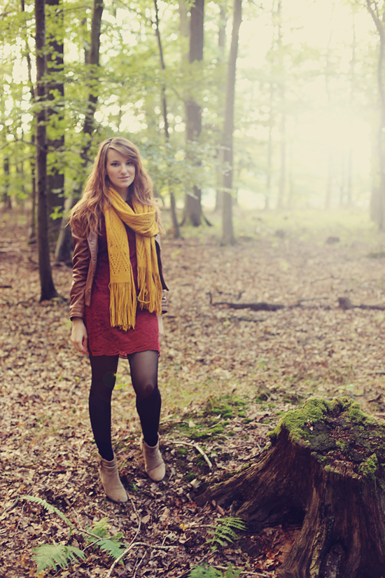 Schönes Outfit. Die beiden Herbstfarben Weinrot und Ocker zu kombinieren finde ich gut. Das Spitzenkleid ist wirklich sehr hübsch. Das Outfit gefällt und ich habe auch für dich abgestimmt (; Viel Glück!