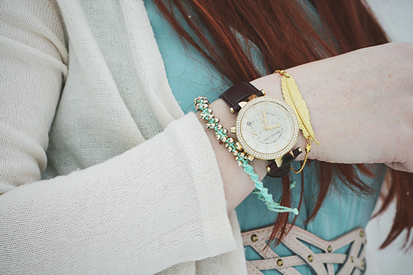Kleid: Primark // Cardigan: Vintage // Fake Fur Schal: H&M // Gürtel: Primark // Boots: Tamaris // Tasche: Hallhuber // grünes Armband: H&M // goldenes Federarmband: Ein Geschenk (ähnliche gibt es bei Etsy.com oder Dawanda.de) // Uhr: Michael Kors Damenchronograph MK2249 (via Preis.de)